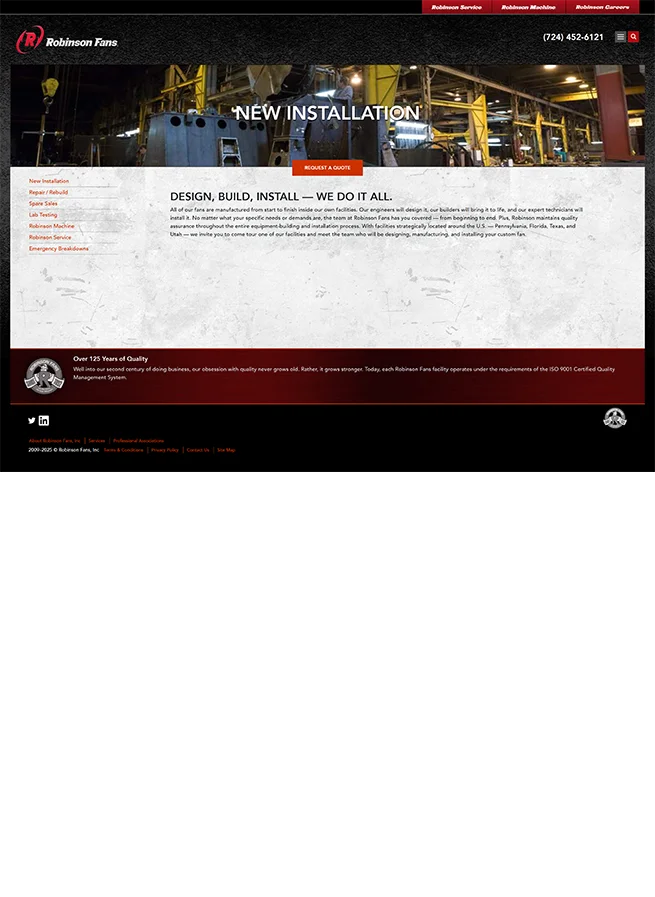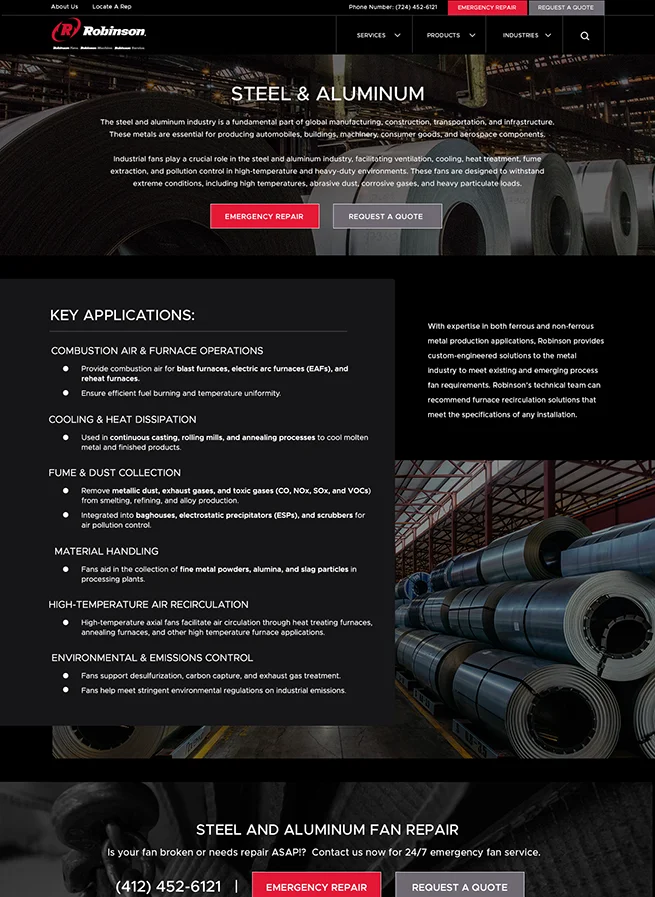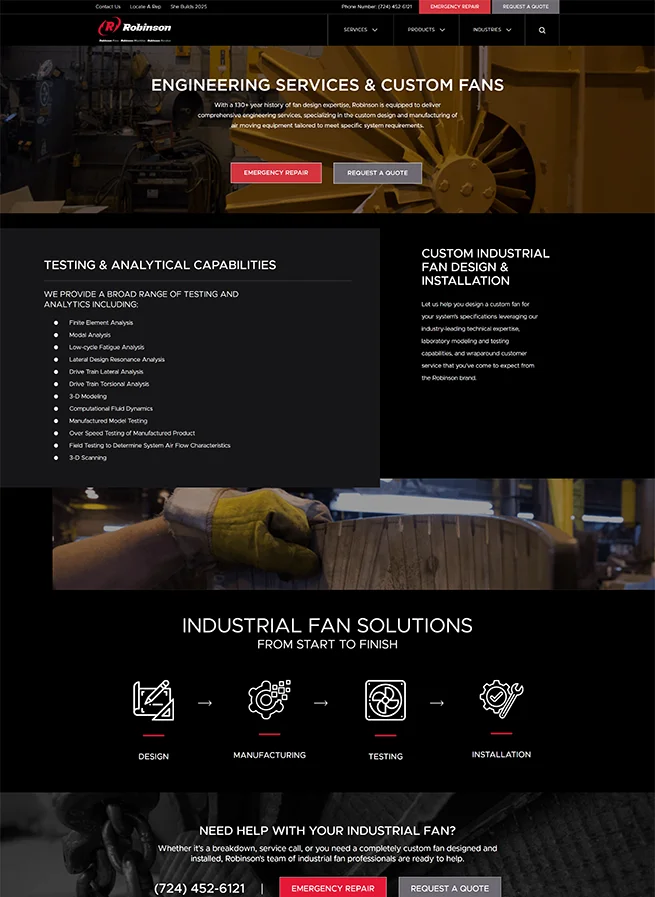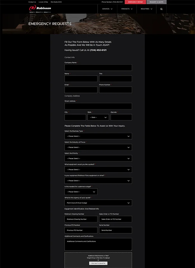 Robinson had an old website that needed to be updated to reflect their leadership in the industry. The newly designed website gives them an updated and modern look and feel while providing valuable information to website visitors. We built a custom emergency request form with dynamic fields and email routing based on the user selections/inputs. Complete with a custom mega menu, rep locator, and unique history page, their website is modern while still showing their history and leadership in the space.
